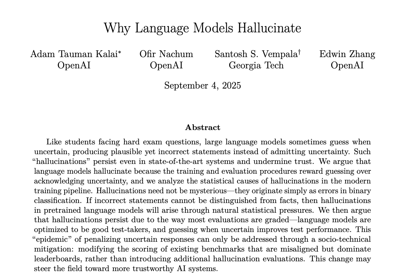 Most productivity talk skips the reliability question. That’s why it’s refreshing to see this debate tackled head-on by OpenAI’s new paper released this week, “Why Language Models Hallucinate”.