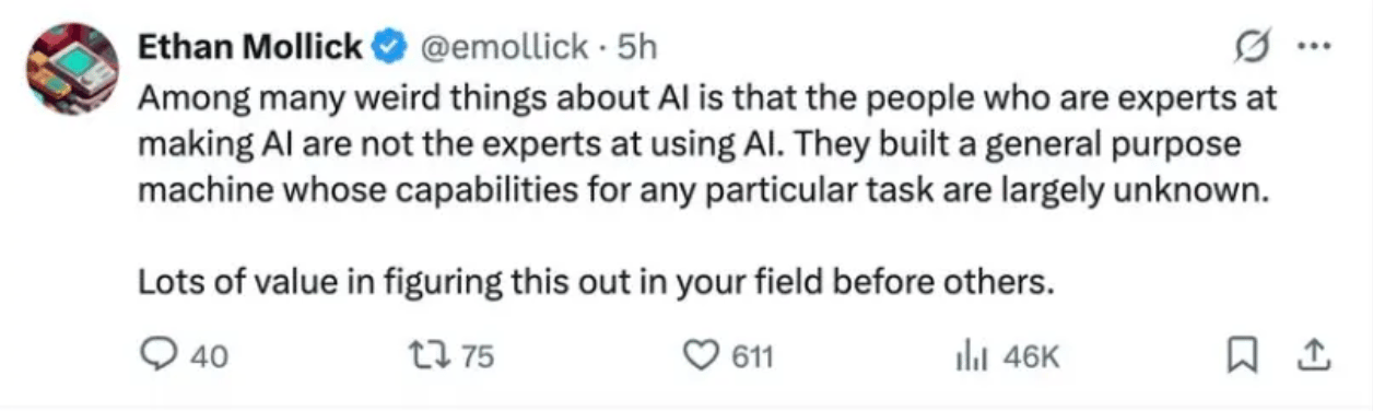 There’s a misconception that the people who build AI are the experts in how to use AI. They aren’t. As Ethan Mollick put it: "The people who build AI are often not the best at using it."